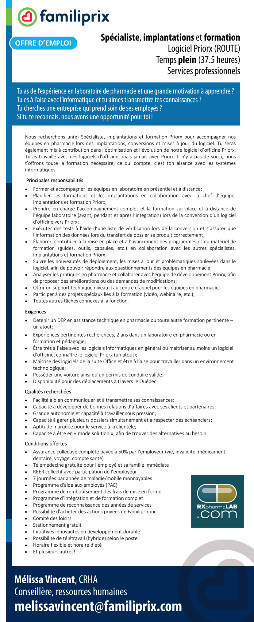 Version LONGUE (détaillée) Cette version présente tous les détails de l’offre : conditions de travail, avantages, horaires, exigences, etc. Disponible sur RXpharmaLAB, elle permet aux candidats intéressés d’avoir un portrait clair et complet de ce que vous proposez, ainsi que vos coordonnées pour vous contacter directement. C’est vers cette version que sont redirigés les candidats après avoir vu la version courte (teaser).