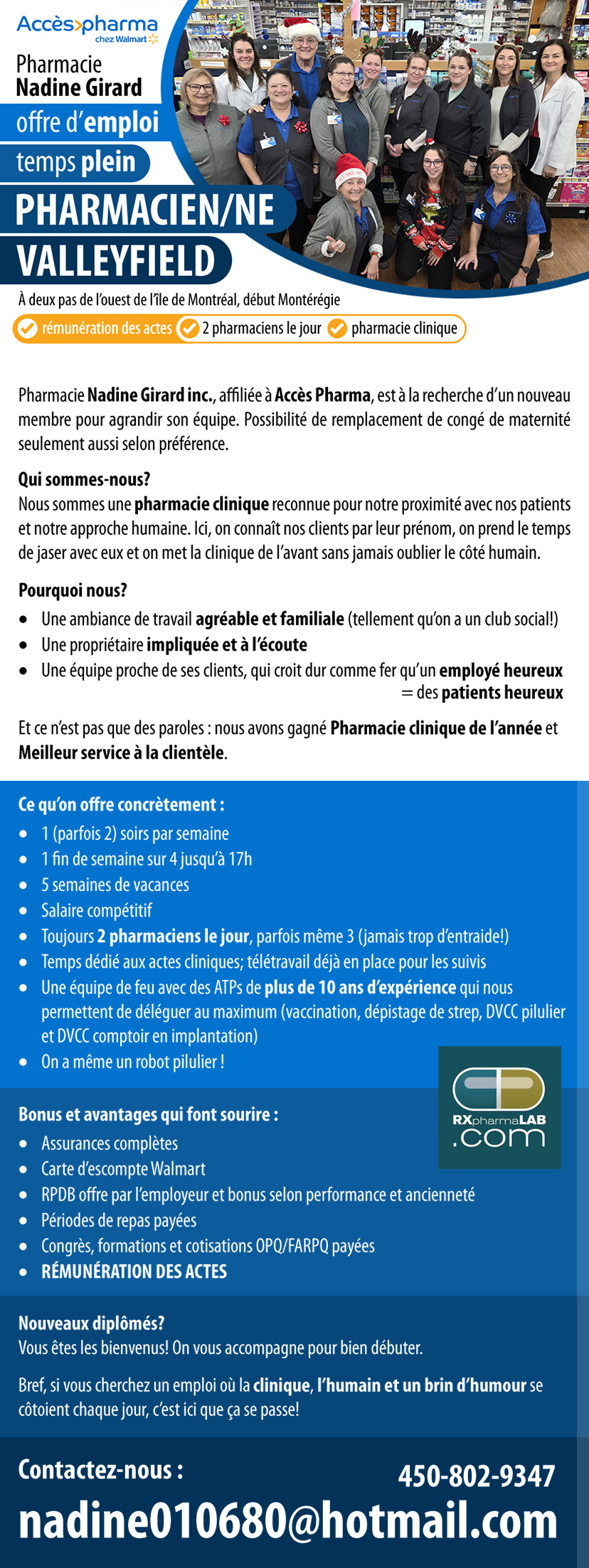 All images, posts, and other content created by THE SITE, as well as the components of the website, remain the exclusive intellectual property of THE SITE. It is prohibited to reproduce, exploit, redistribute, or use these elements, even partially. Advertising creations such as layouts and images used for ads remain the exclusive property of THE SITE. These elements cannot be altered in any way, and the logos of RXpharmaLAB, emploiSANTEquebec, and/or JobLynx.ca must remain visible. Clients are authorized to use and distribute the ads and promotional images only during the validity period for which they have paid.